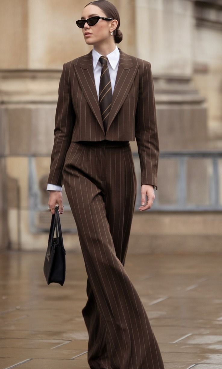 This chocolate-brown pinstripe set brings a bold twist to power dressing. The cropped blazer features sharp lapels and a clean, structured cut that pairs effortlessly with high-waisted, wide-leg trousers for a striking silhouette.